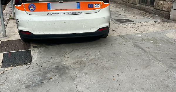 L'auto della protezione civile parcheggiata su un marciapiede