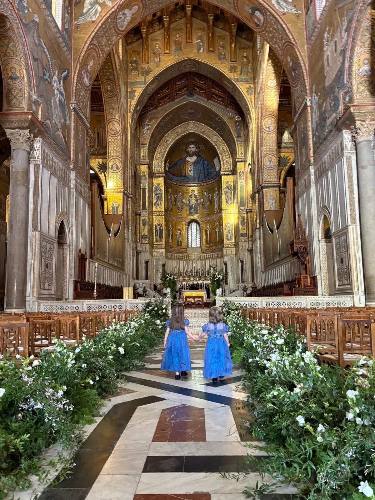 Protagonista assoluto dell’allestimento è stato il tema dell’oro, scelto come omaggio ai celebri mosaici della Cattedrale. Un filo conduttore che ha attraversato ogni dettaglio: dalle decorazioni agli abiti del personale, alle damigelle in abito dorato che hanno accolto gli invitati, fino all’atmosfera complessiva. Dopo la cerimonia, i festeggiamenti si sono spostati nel Chiostro di Santa Maria La Nuova, trasformato in un elegante giardino mediterraneo. Tra limoni, mandarini e antiche giare, gli ospiti hanno potuto immergersi nei colori e nei profumi dell’Isola.