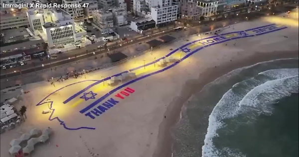 L'Air Force One su cui viaggiava il presidente Donald Trump ha sorvolato, poco prima dell'atterraggio all'aeroporto Ben Gurion di Tel Aviv, la costa israeliana su cui era stata fatta una scritta enorme disegnata in giallo e blu sulla sabbia con le scritte in inglese "Grazie" e "Casa". Lo si legge sull'account ufficiale dello staff presidenziale Rapid Response 47 che pubblica anche il video del sorvolo. "Un enorme cartello di ringraziamento al presidente Trump è esposto sulla spiaggia di Tel Aviv, che l'Air Force One vedrà mentre si avvicina all'aeroporto Ben Gurion" si legge. I sistemi di tracking dei voli hanno mostrato la traiettoria circolare compiuta dal velivolo in avvicinamento alla costa israeliana.